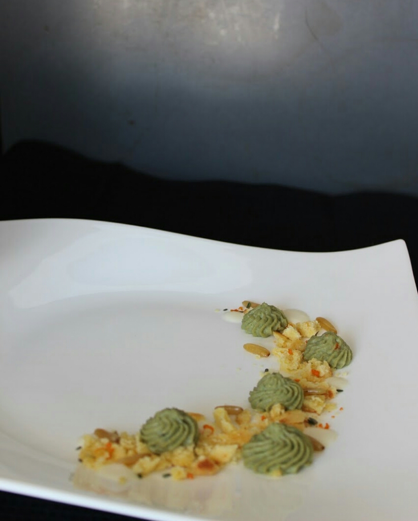 Disponete delle bricciole di frolla a formare una mezza luna, mettete dei ciuffi di crema di carciofi e con un cucchiaino disponete della vellutata di pecorino, e a decorazione delle zeste d’arancia bio, dei pinoli e delle piccole foglioline di timo.