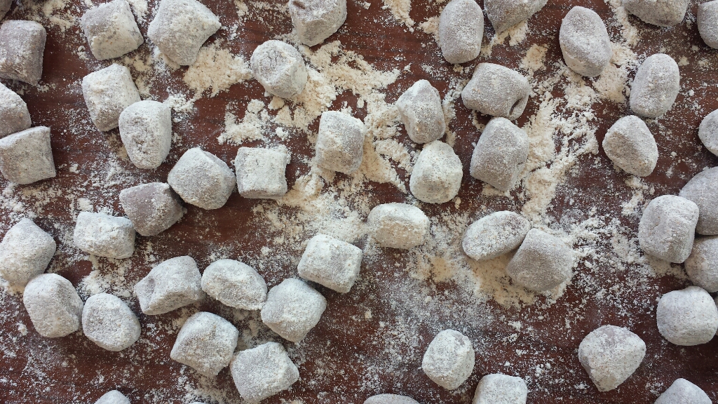Ricavatene dei filoncini che con l’aiuto di un tarocco, ne farete dei piccoli tocchetti. Se lo gradite, con i rebbi di una forchetta potete creare le tipiche righine degli gnocchi, che io ho ommesso per scelta.